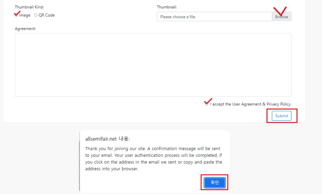 2. 회원가입 창에서 빈칸에 입력 및 체크(칸에 !표시는 필수적으로 채워야함)