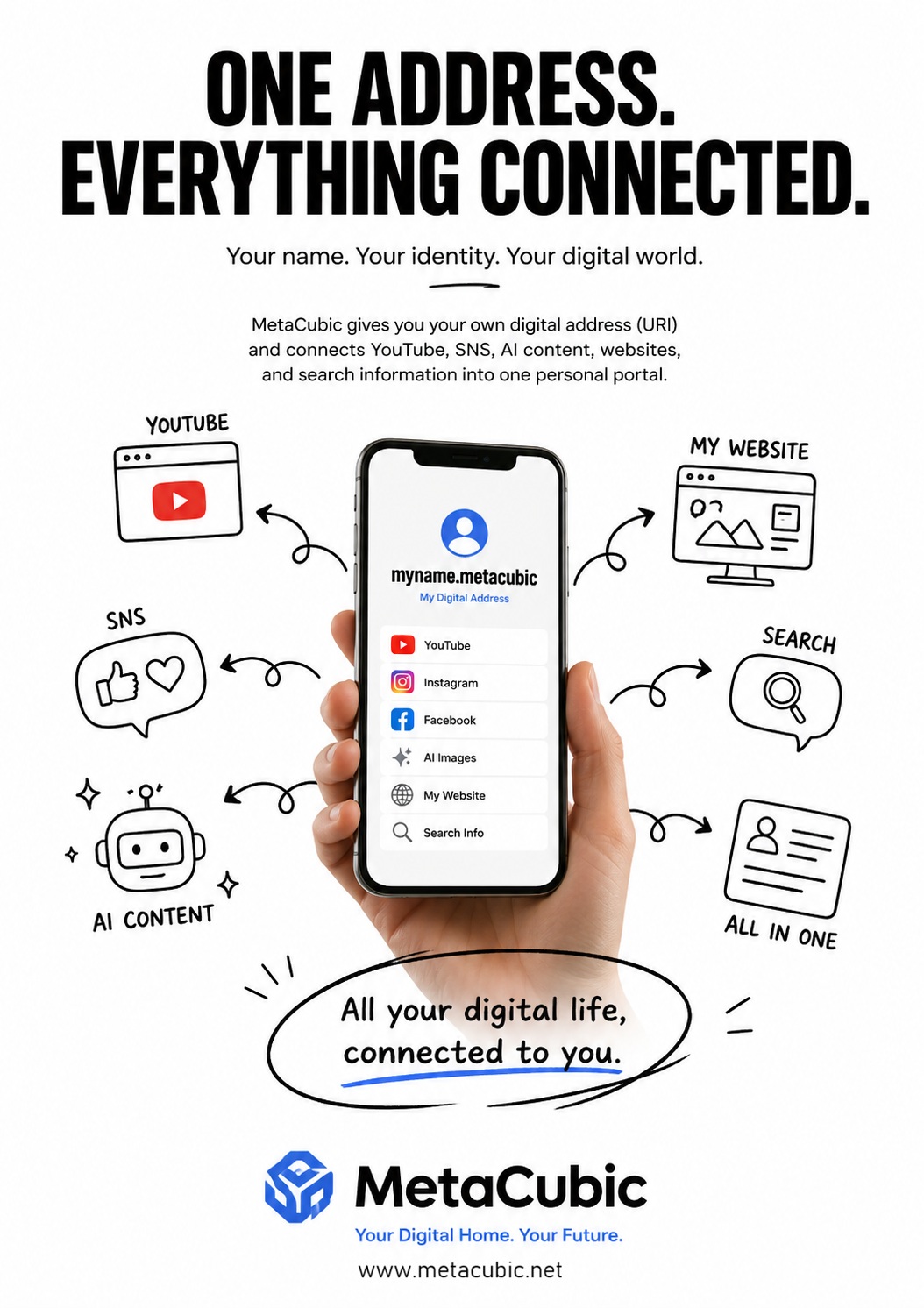 내 이름의 디지털 주소로, 모든 디지털 세상을 하나로. 메타큐빅은 당신마의 디지털 주소URI 을 통해 유트부, 인스타그램, 릴스, AI 컨텐트, 홈페이지, 검색 정보를 만들어 개인들에게 나누어주고 모두 연결하는 개인 포털 플랫폼입니다.